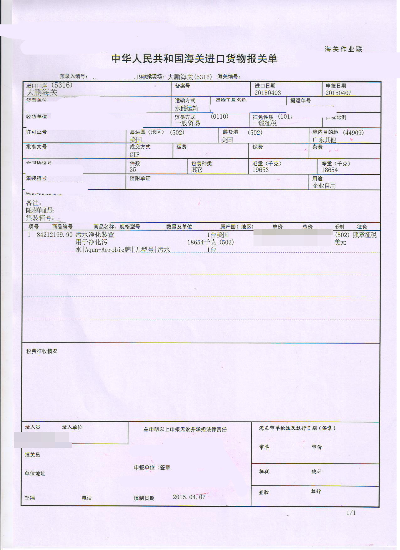 - 污水凈化裝置進(jìn)口報(bào)關(guān)案例