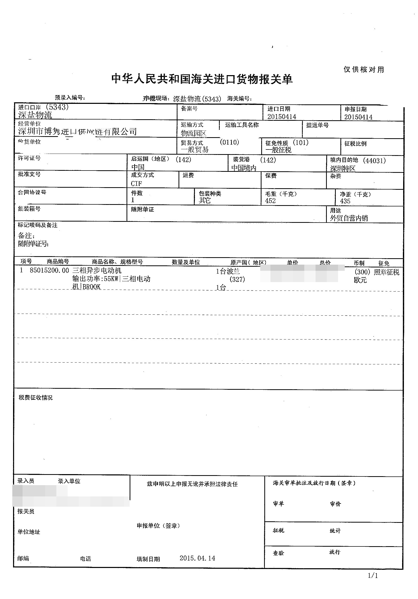 三、三相異步電動機進口報關(guān)案例展示