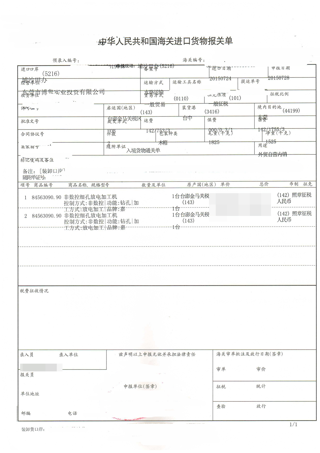 操作貨物:非數(shù)控細(xì)孔放電加工機(jī)
