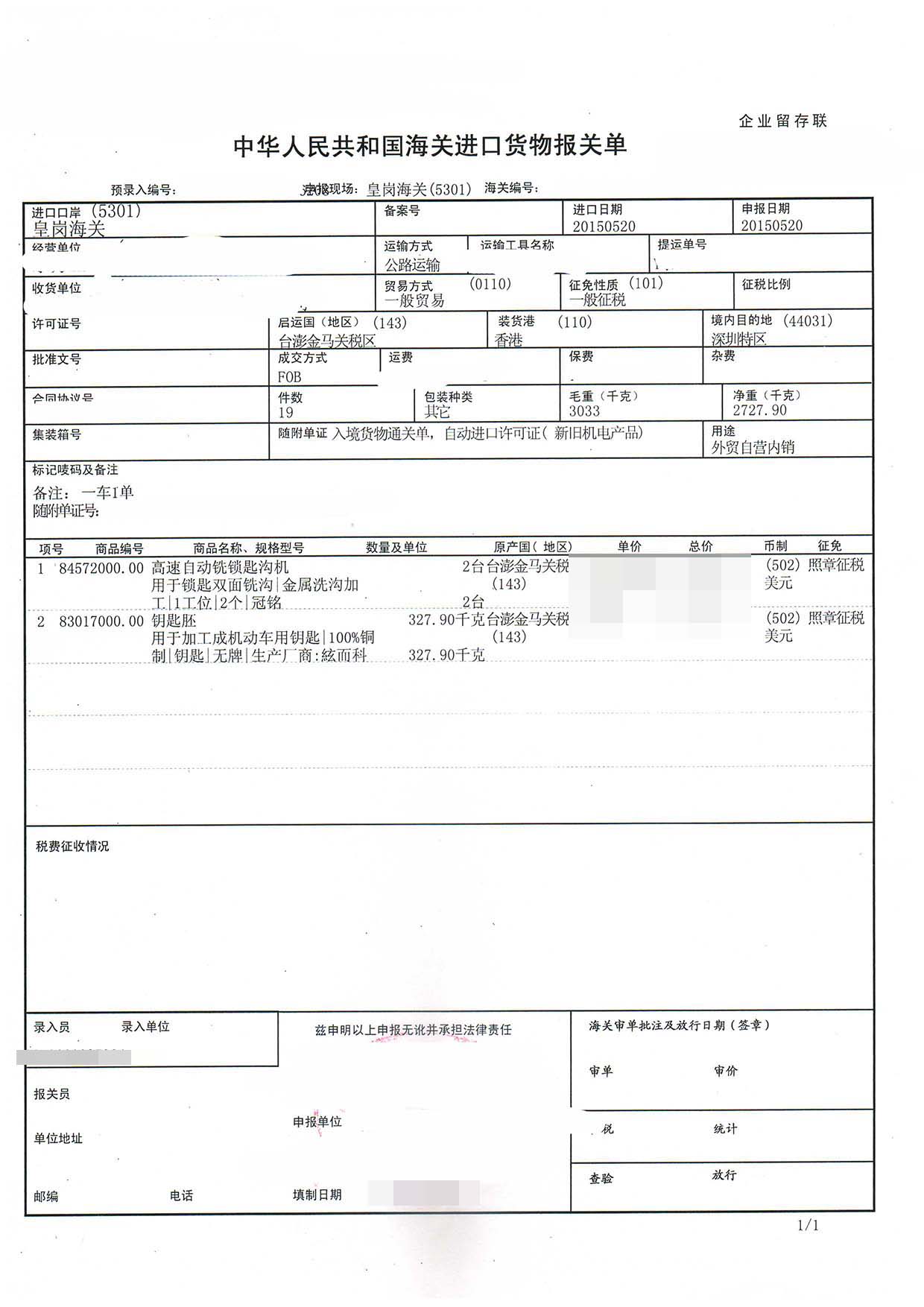 高速自動銑鎖匙溝機進口報關(guān)手續(xù)及案例【進口知識】