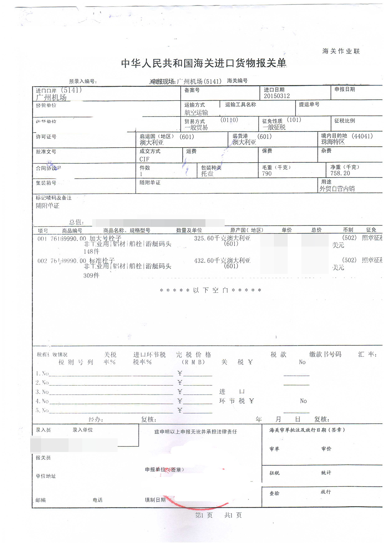 進口日期:20150312客戶:珠海某游艇服務(wù)有限公司
