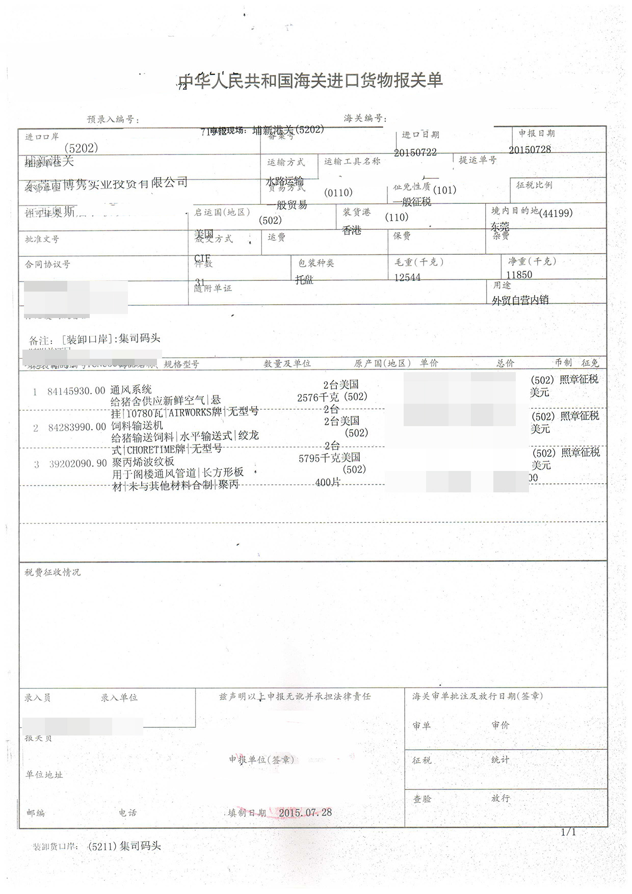 操作貨物:通風(fēng)系統(tǒng)、飼料輸送機(jī)、聚丙烯波紋板