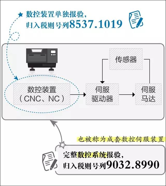 同時,由8537.1019的“數(shù)控裝置”、9032.8990的“伺服驅(qū)動器”、85.01項下“伺服馬達以及傳感器、線纜等附件”(不管這些附件是否一同報驗)構(gòu)成的成套裝置(行業(yè)稱之為“數(shù)控系統(tǒng)”),無論對其如何命名,均應歸入稅號9032.8990。P.S.:在9032.8990.50/70列名中,相同商品使用“成套數(shù)控伺服裝置”的名稱來替代“數(shù)控系統(tǒng)”。