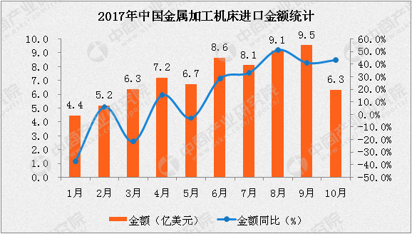2017年10月中國(guó)金屬加工機(jī)床進(jìn)口金額6.3億美元,同比增長(zhǎng)43.1%。1-10月,中國(guó)金屬加工機(jī)床進(jìn)口金額達(dá)71.4億美元,同比增長(zhǎng)13.1個(gè)百分點(diǎn)。