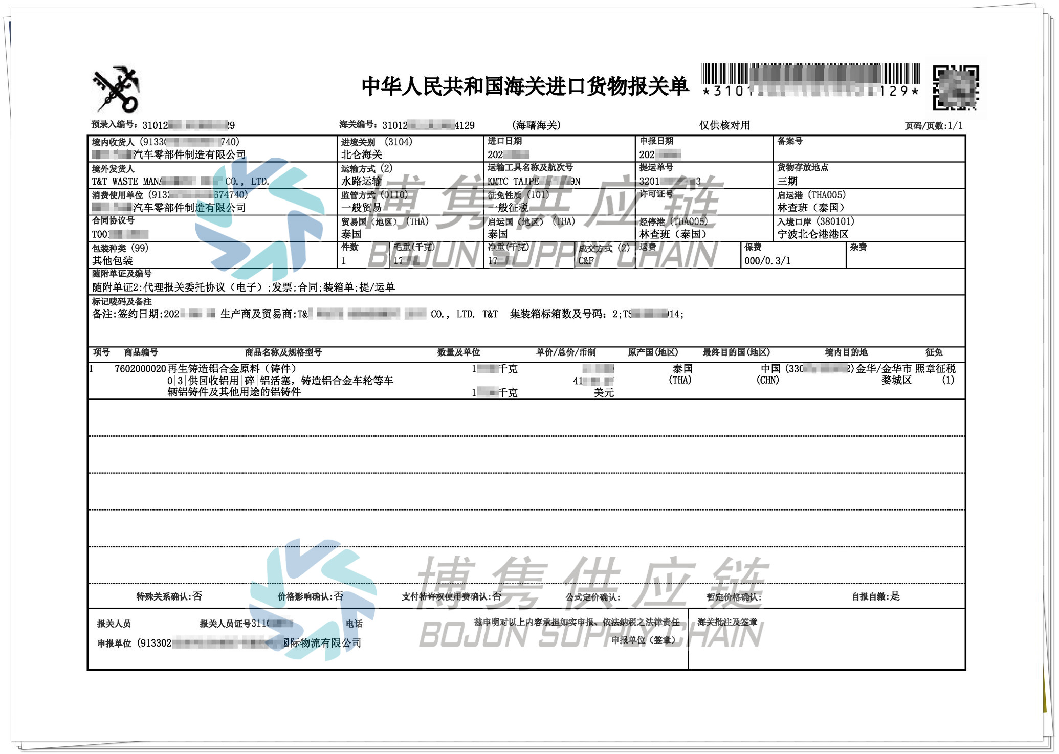 1、博雋供應(yīng)鏈對(duì)再生金屬(再生銅、鋁、鋁錠)有著豐富的進(jìn)口經(jīng)驗(yàn),代理過(guò)多家企業(yè)進(jìn)口。2、所有資料模板博雋皆可提供,減少企業(yè)整理資料的麻煩,省事省心,提高效率。